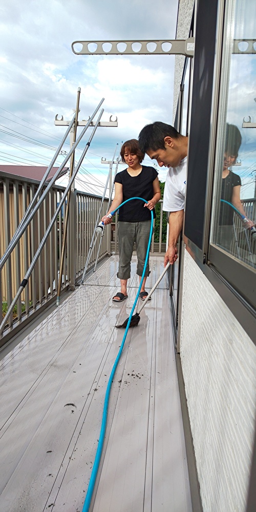洗濯物干場を、朝から‘世話人Aさん”と利用者の‘Kさん”で